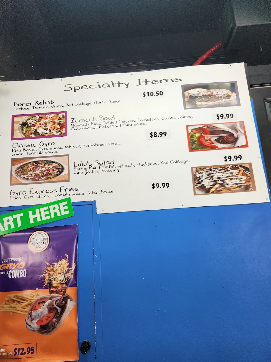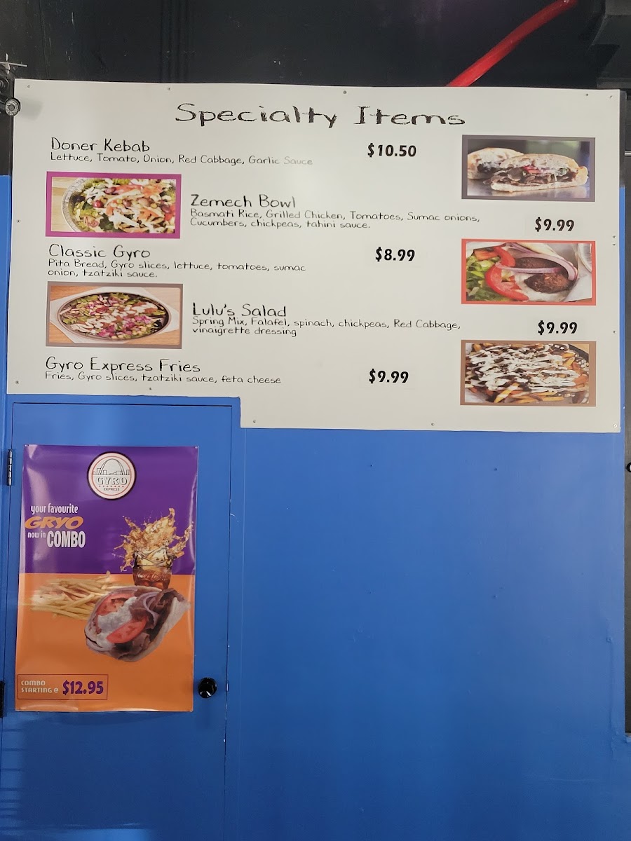 Pita bread, gyro slices, lettuce, tomatoes, sumac onions, tzatziki sauce.
