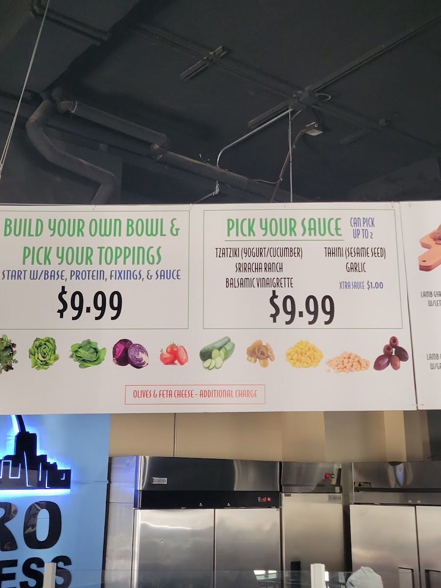 Basmati rice, choice of protein, tomatoes, sumac onions, cucumbers, chickpeas, tahini sauce.